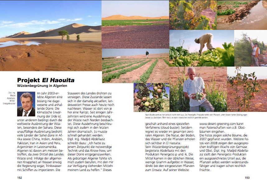 Das Projekt Desert Greening wurde 2004 in El Haouita von Madjid Abdellaziz ins Leben gerufen. Am 7. Juli 2005 erzeugte er erstmals in der algerischen Wüste Regen.